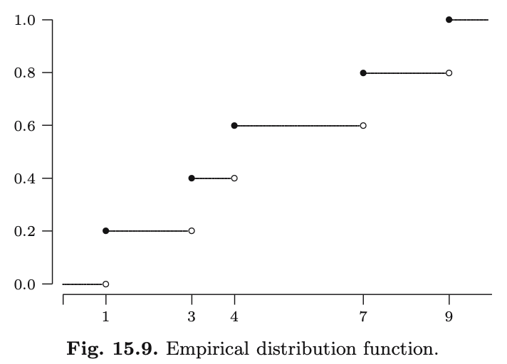 The empirical (cumulative) distribution function, or, eCDF, is defined by \[ F_n(x)=\frac{\big\lvert \{x_i \vert x_i\leq x \} \big\rvert}{n} \]