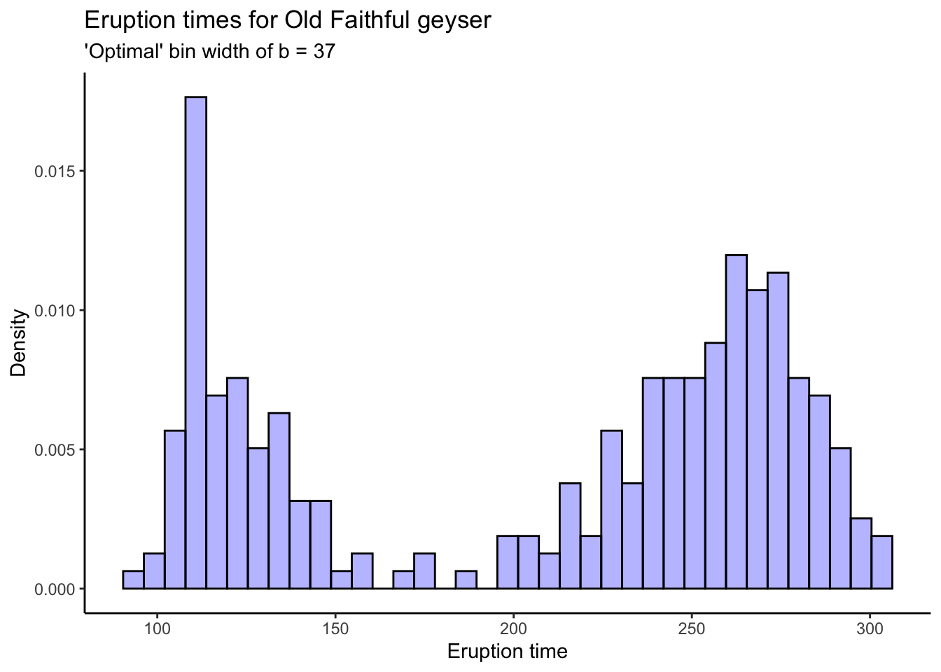 Put data into \(m\) bins, \(B_1, ..., B_m\), \[ B_i=\left[x_0+(i-1)b, \;x_0+ib\right) \] where \(b\) is the bin width.