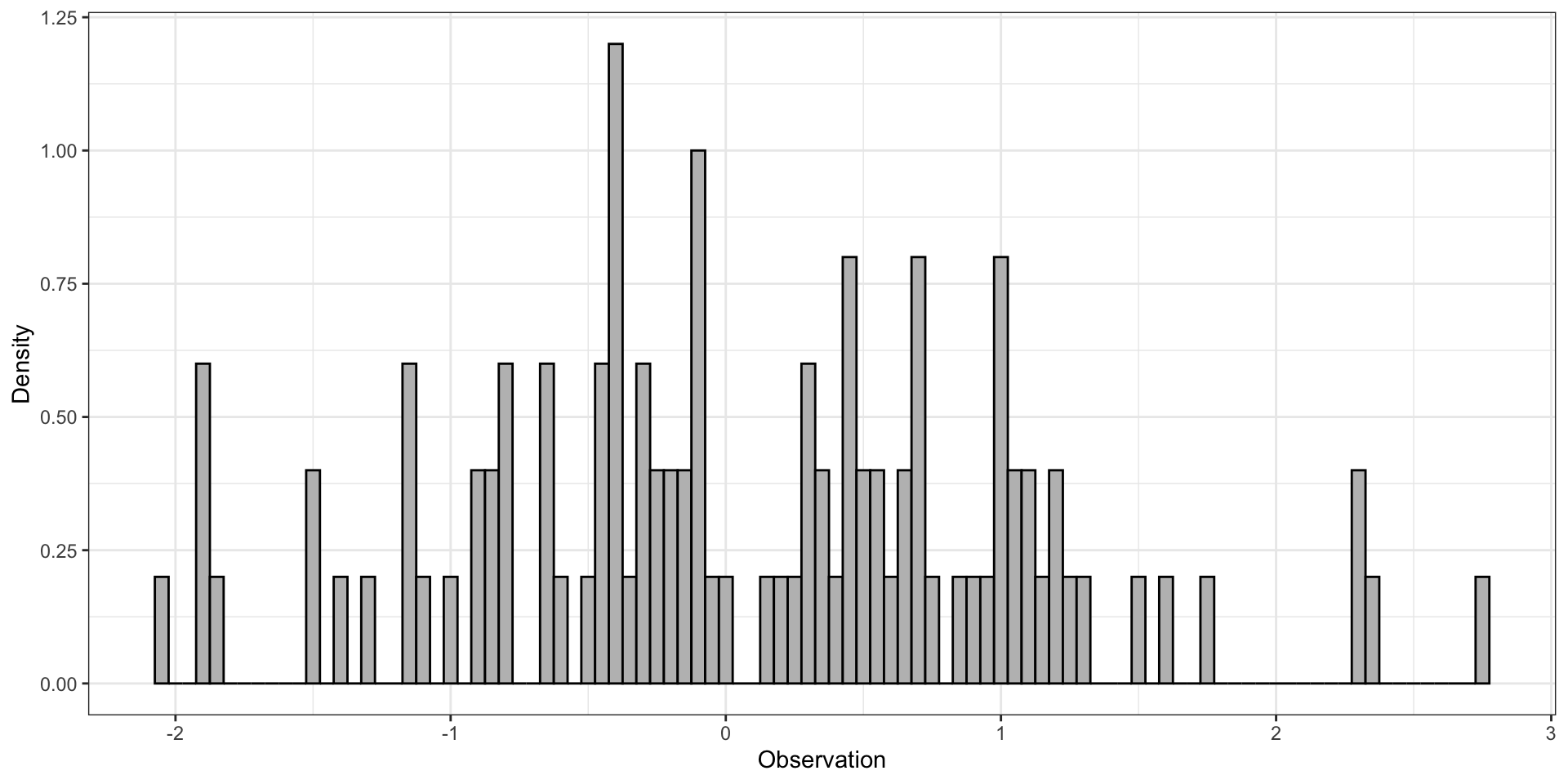 With appropriate scaling of the height of the bins, histograms can be a crude estimate of an unknown probability density \(f\) under which the data was generated.