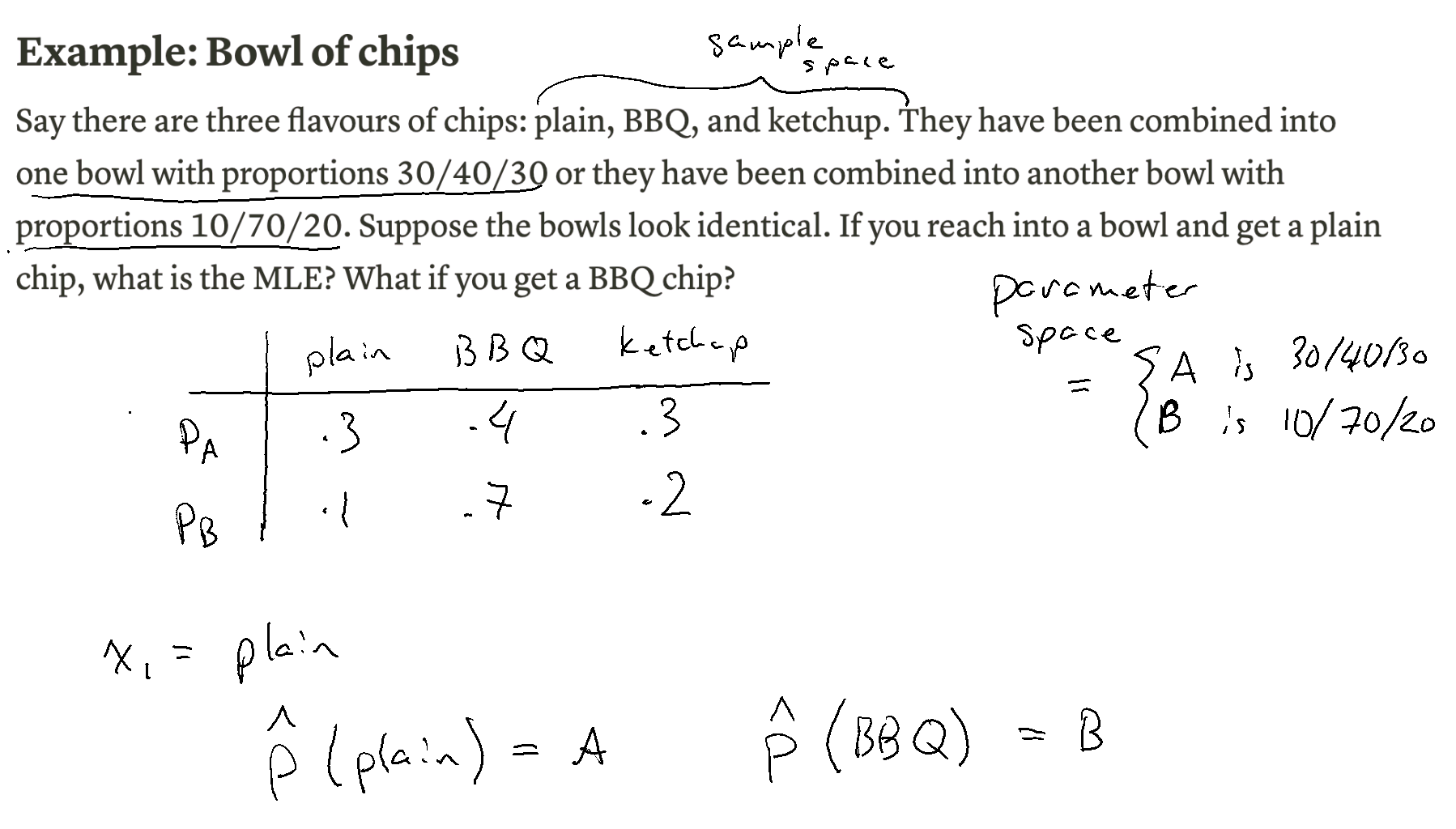 Example 1 Say there are three flavours of chips: plain, BBQ, and ketchup. They have been combined into one bowl with proportions 30/40/30 or, in another bowl, with proportions 10/70/20. If you reach into a bowl and get a plain chip, what is the MLE? What if you get a BBQ chip?