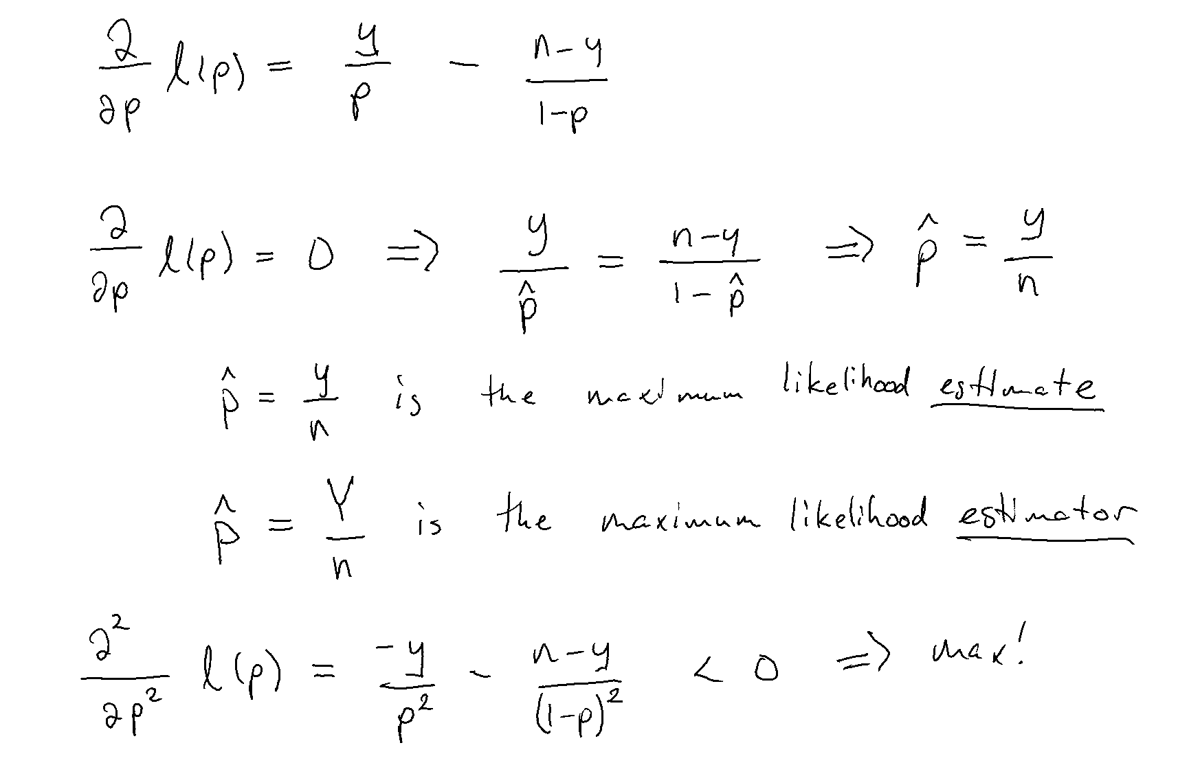Example 3 Consider a random sample \(X_1,...,X_n\) where \(X_i \sim Bernoulli(\theta)\). Let \(Y=\sum_{i=1}^n X_i\) represent the number of successes and \(Y\sim Binomial(n,\theta)\). What is the MLE for \(\theta\)?