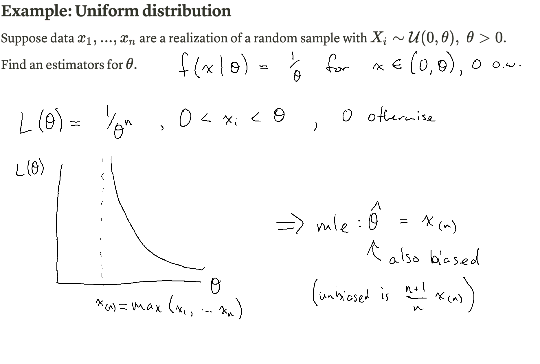 Example 2 Suppose data \(x_1,...,x_n\) are a realization of a random sample \(X_1,...,X_n\) such that \(X_i\sim\text{U}(0,\theta),\;\theta >0\). Find the MLE for \(\theta\).