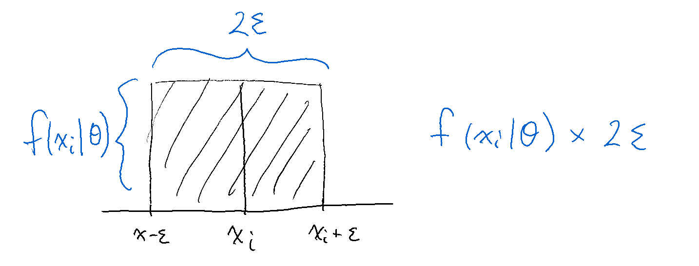\[ \begin{gather*} P(x_1-\epsilon \leq X_1 \leq x_1+\epsilon) \times...\times P(x_n-\epsilon \leq X_n \leq x_n+\epsilon) \\ \approx f(x_1|\theta) \times...\times f(x_n|\theta) \times (2\epsilon)^n \end{gather*} \] Since the value of \(\epsilon\) won’t effect the location of the maximum, we can choose \(\theta\) such that \(f(x_1|\theta)\times ...\times f(x_n|\theta)\) is maximized.