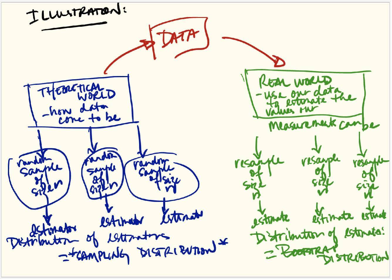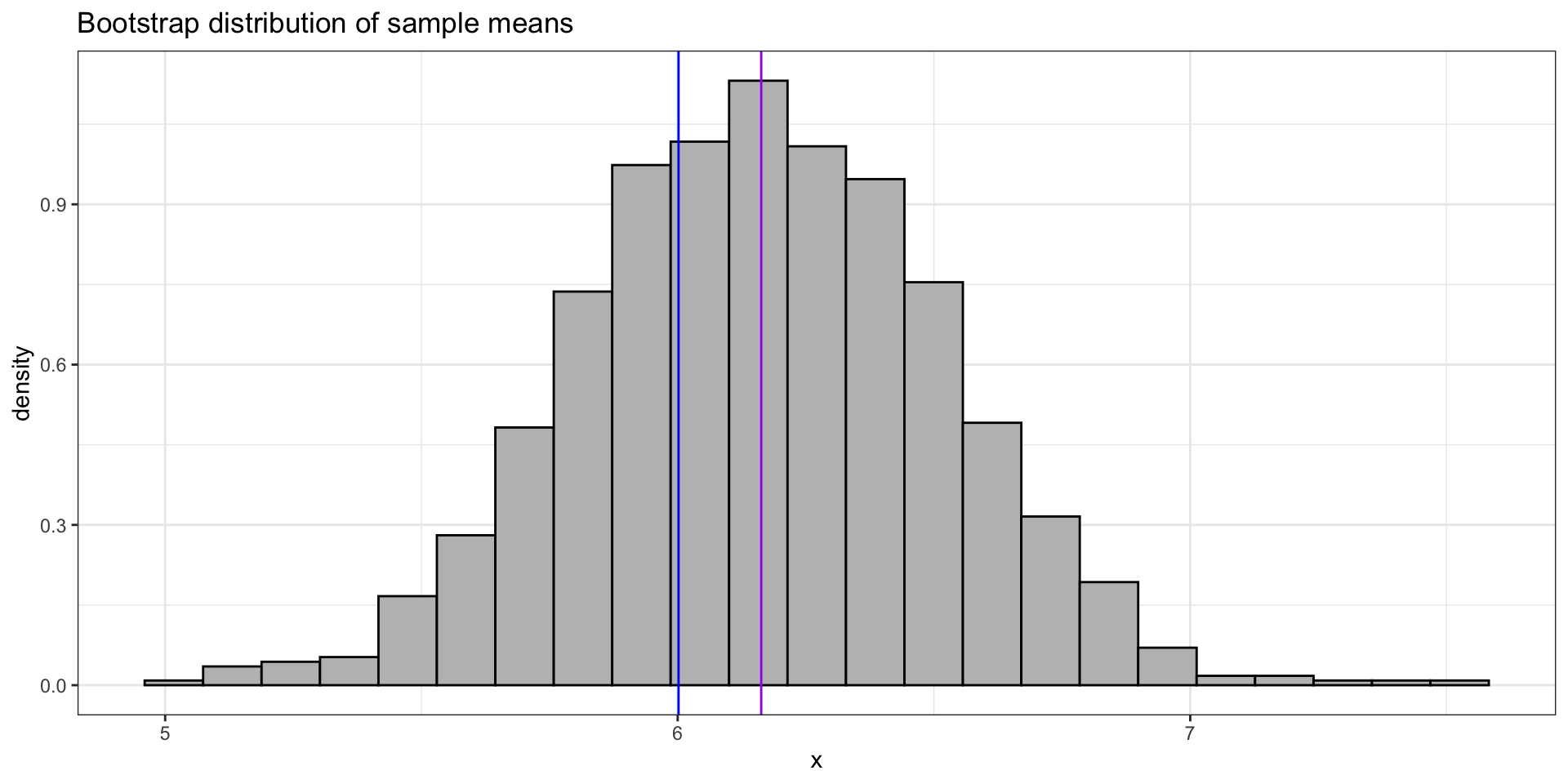 ⚠️ The bootstrap does not give a better estimate than the original data because the bootstrap distribution is centered around a statistic calculated from the data. Drawing thousands of bootstrap observations from the original data is not like drawing observations from the underlying population (i.e. the theoretical world). It does not create new data.