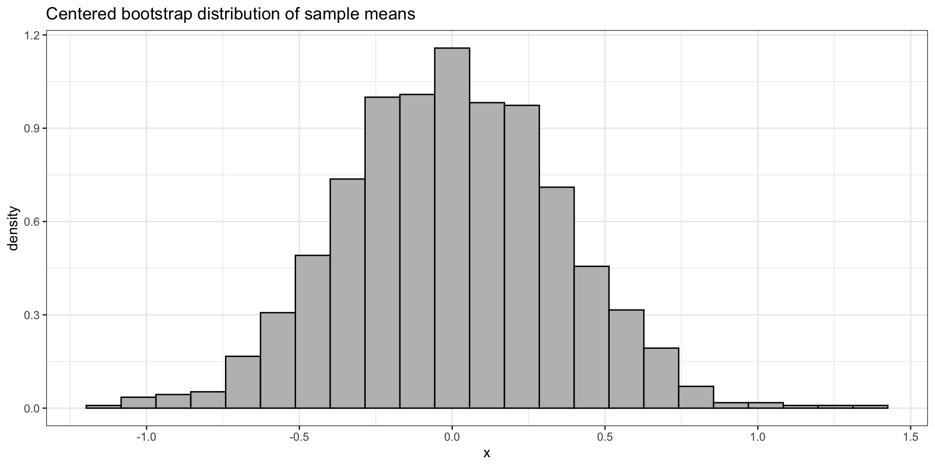 labs(title = "Centered bootstrap distribution of sample means", y = "density") In this course, please do not use the boot package or any other similar packages.