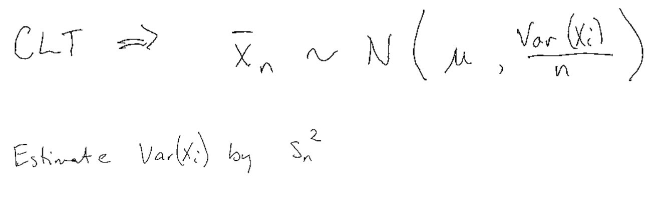 Suppose our data \(x_1,...,x_n\) is a realization of a random sample, \(X_1, ..., X_n\), and we want to find a confidence interval for the mean, \(\mu =\mathbb{E}[X_i]\).