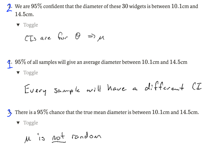 Example: A sample of \(30\) widgets is taken off an assembly line for quality control and the diameter of each is measured. A \(95\%\) confidence interval for the mean diameter is \((10.1, 14.5)\) cm.