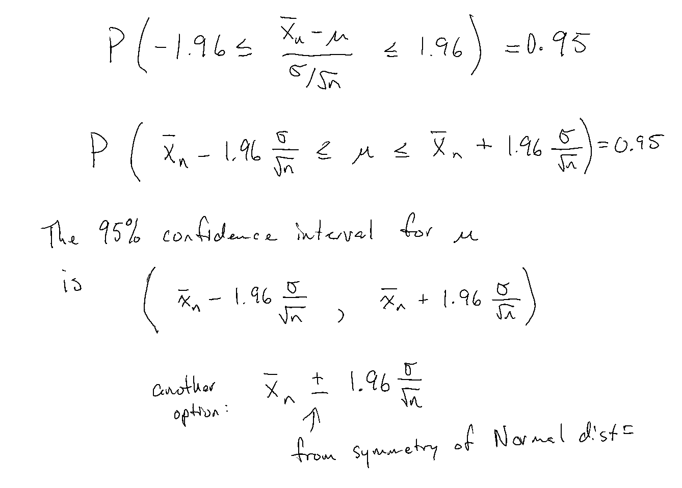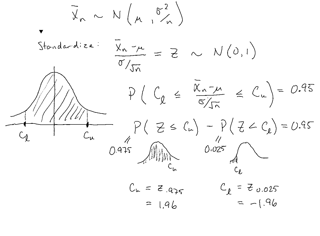 \[ \Pr\left( -z_{\alpha/2} < \frac{\bar{X}_n-\mu}{\sigma/\sqrt{n}}< z_{\alpha/2} \right)=1-\alpha \]