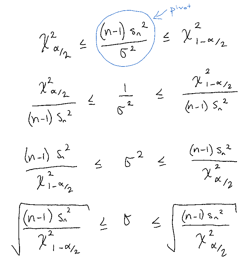 Example 3 Say we have a random sample \(X_1, ..., X_n\overset{iid}{\sim}\text{N}(\mu,\sigma^2)\), but we do not know \((\mu,\sigma^2)\). We want a confidence interval for \(\sigma\).