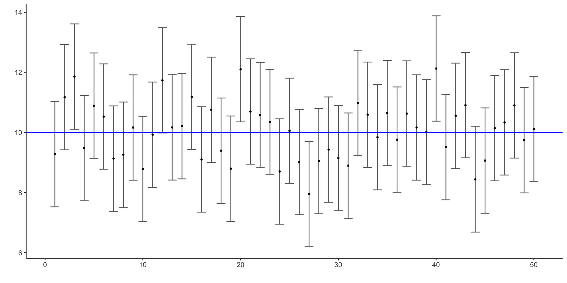 Plot the first \(50\) confidence intervals, along with the sample mean for each.