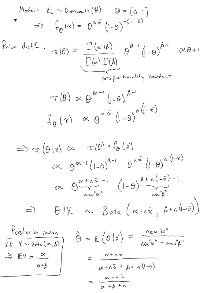 Example 1 (Bernoulli model with Beta prior) Suppose we have a random sample \(X_1,...,X_n \overset{iid}{\sim} \text{Bernoulli}(\theta)\) and choose prior distribution \(\theta\sim\text{Beta}(a,b)\).