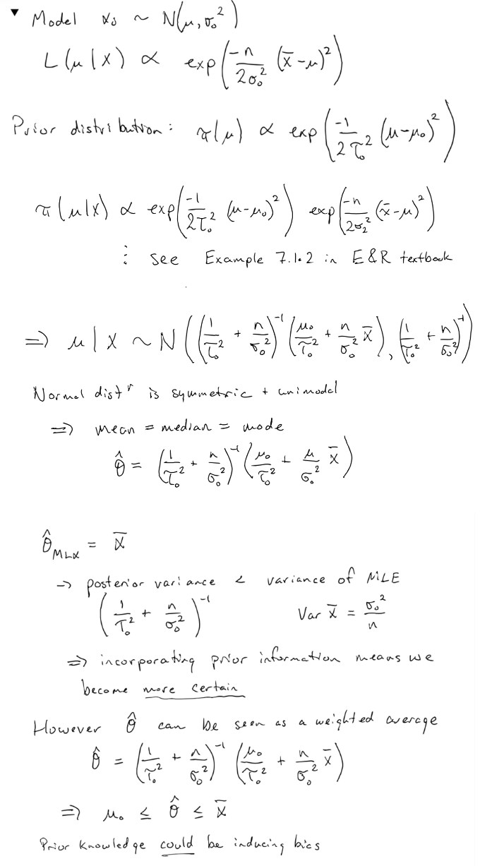 Example 3 (Location Normal model with Normal prior) Suppose we have a random sample \(X_1,...,X_n \overset{iid}{\sim} \text{N}(\mu, \sigma_0^2)\) with \(\sigma^2_0\) known and choose prior distribution \(\mu \sim \text{N}(\mu_0,\tau_0^2)\).
