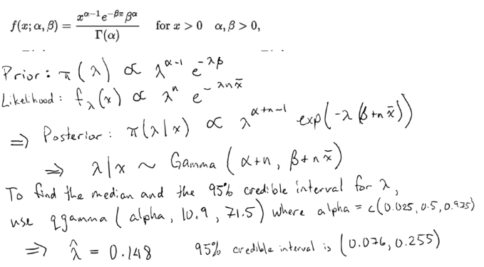 Example 5 (Exponential model with Gamma prior) Let \(X_1,...,X_n \overset{iid}{\sim} \text{Exp}(\lambda)\) with density \(f_\lambda (x_i)=\lambda e^{-x_i\lambda}\). Use prior distribution \(\lambda \sim\text{Gamma}(\alpha,\beta)\) where \((\alpha,\beta)=(2, 3)\). Suppose we observe 7 in a sample of size \(n=10\).